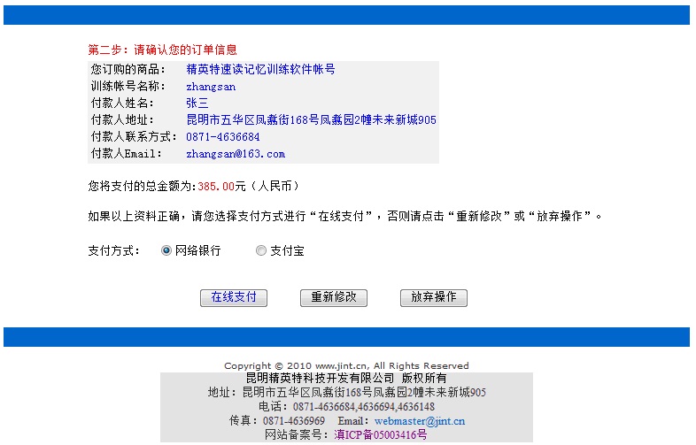 第一步:點(diǎn)擊網(wǎng)上在線支付進(jìn)入下面網(wǎng)頁(yè),請(qǐng)認(rèn)真填寫訂單信息;